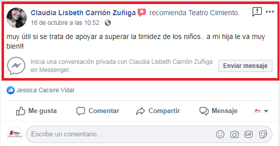 Estos son algunos de los testimonios de los padres de familia. Para ver más testimonios de los padres de nuestros alumnos, pueden ingresar a nuestra red social de Facebook e ir a la opción de "OPINIONES", o darle clic en el siguiente enlace: https://web.facebook.com/TeatroCimiento/reviews/?ref=page_internal